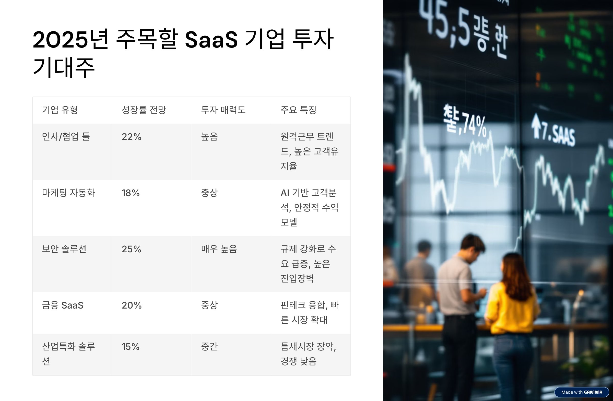 이처럼 SaaS 시장에서도 고객군에 따라 수익성과 성장성이 다르기 때문에, 투자 시 비즈니스 모델의 방향성과 고객층을 면밀히 분석해야 해요.